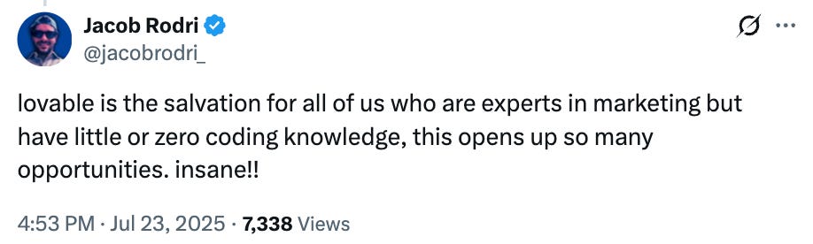 I spend a decent amount of time on Twitter and even though I had never used the product (before writing this post), I still had seen quite a few people who are not on the Lovable team share the apps they built and get thousands of views.