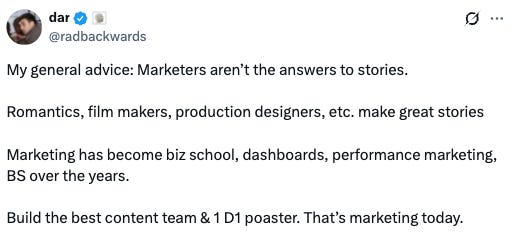 “The most elite storytellers are founders.” I love this take. Founders live and breathe the product. They know the struggles, the pivots, the vision, the why behind every decision. That authenticity is nearly impossible to replicate.
